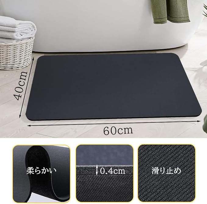 1.素材:珪藻土+天然ゴム 三層構造:ナノファイバー透水層、珪藻土吸水層、滑り防止層 2.お風呂あがりびしょびしょの足元の水滴を瞬時吸い取ってくれる。 3.浴室だけではなく、洗面所・脱衣所・ペット用や玄関などの場所で活躍できる 4.硬いタイプよりソフト珪藻土バスマット一切割れず、冷たくない、カビを削る作業も不要です。 5.汚れやごみなどは簡単に洗い流される