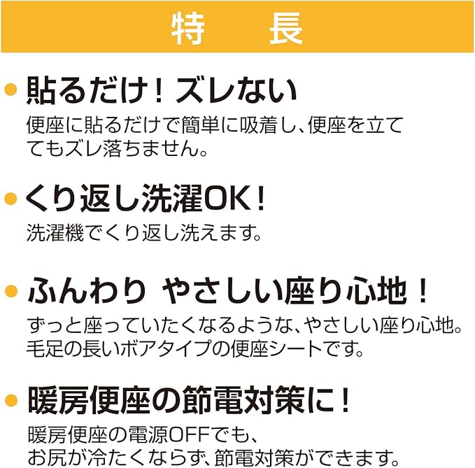 【貼るだけ簡単!ふんわり優しい座り心地に】トイレの便座に貼ってお尻の冷えを防止するふっくら便座シート。便座を立ててもずれずにぴたっ!とくっつきます。暖房便座の電源OFFのままでもお尻が冷たくならず、冬はしっかり節電対策ができます。毛足の長いボアタイプなので、ふんわり優しい座り心地です。