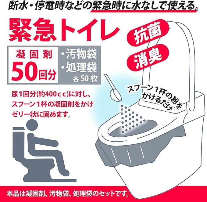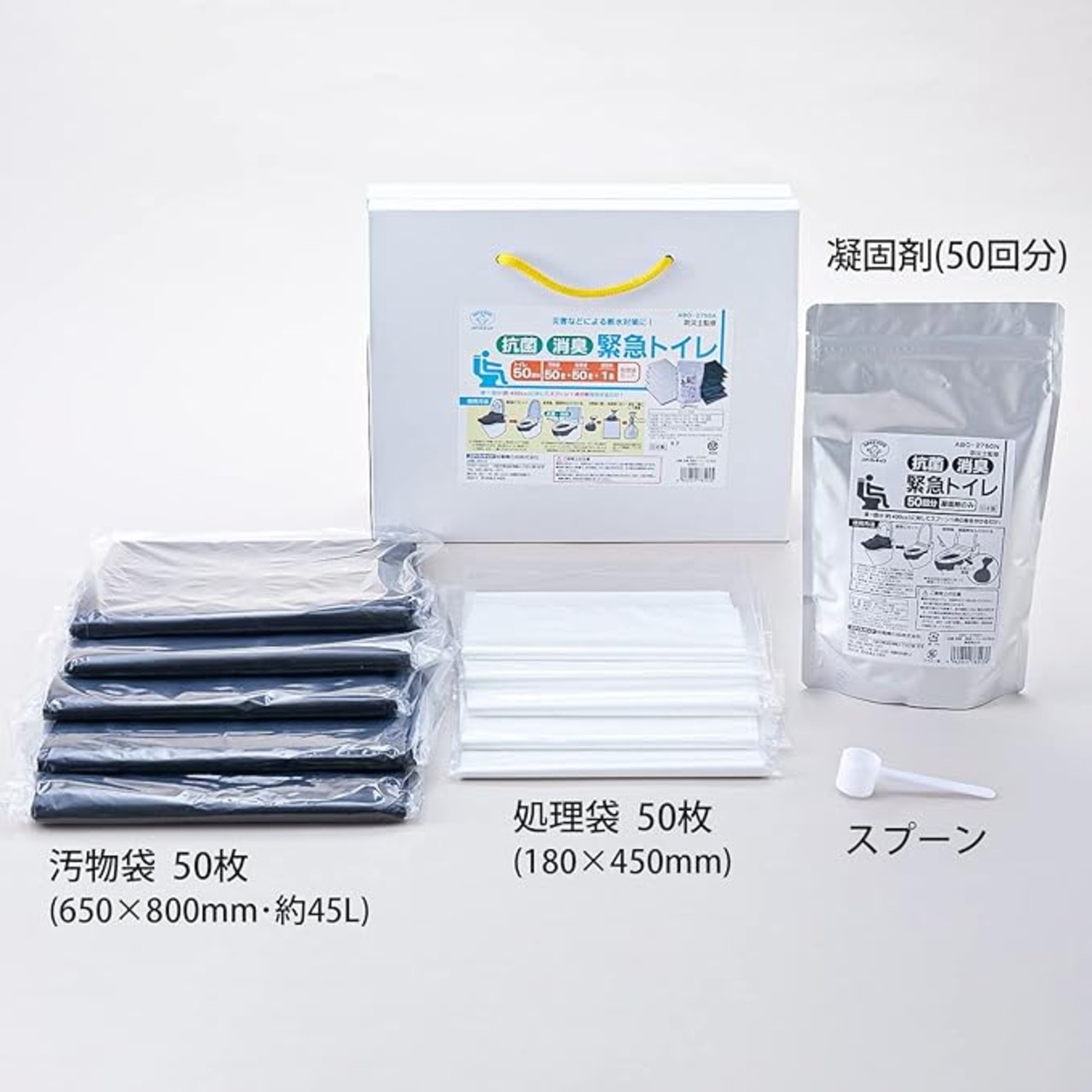 [セット内容]凝固剤400g(50回分)、汚物袋(650 800mm・約45L) 50枚、処理袋(180 450mm) 50枚、スプーン 1本