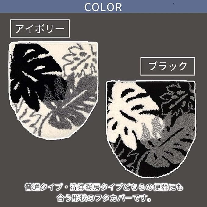 インテリアで人気のあるモンステラ柄とモノトーンカラーを組み合わせた高級感のあるトイレファブリックシリーズです。毛足の長いマイクロファイバー糸を高密度に敷き詰めました。普通便器と洗浄暖房便器のどちらにでも取り付け可能のフタカバーなので、買い間違いもありません。洗濯OK。