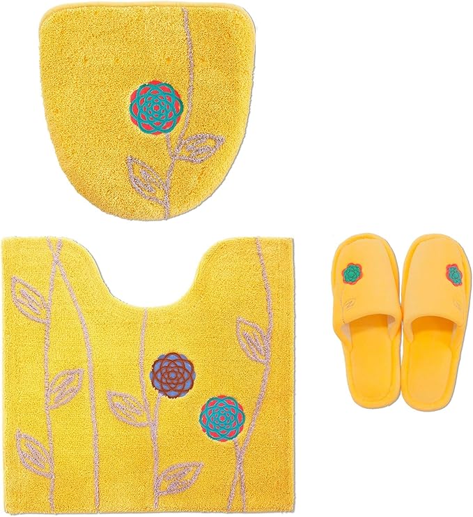 風水で、黄色は金運を良くするといわれています。 黄色が鮮やかなトイレマットで金運を呼び込みましょう! ●洗浄暖房便座用ふたカバー トイレマット3点セット。 ●丸洗いができるのでいつも清潔にお使いいただけます。 ●ナチュラルなテイストを表現したトイレタリー。 ●花の茎には綿糸を使い、素材感の違いが暖かさを表します。 ●刺繍のモチーフは切り絵のお花をあしらいました。