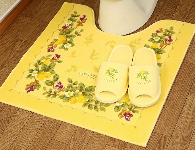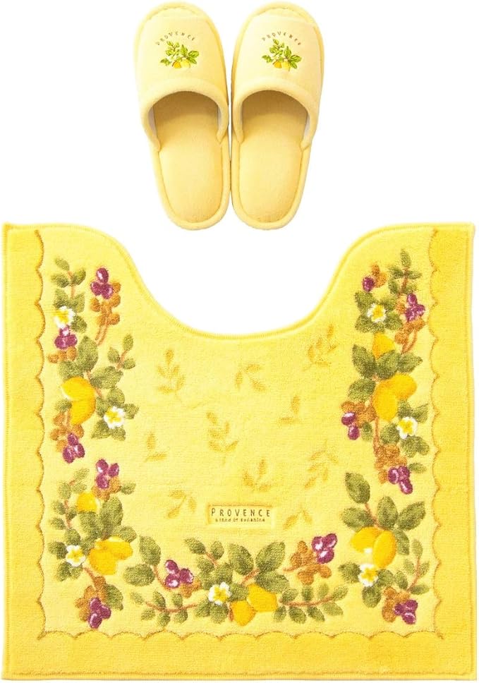 ●洗浄暖房型・普通型共用ふたカバー、スリッパの2点セット。 ●丸洗いができるのでいつも清潔です。 ●ナチュラルなテイストを表現したトイレタリー。 ●トイレマットは日本製ならではのカーヴィング技法で、立体感を表現。 ●マットは日本製です。 ※オカ プロヴァンス イエロー ※セット 1:トイレマット(約58cm 60cm ) 2:スリッパ ※素材・詳細:トイレマット: サイズ:約58cm 60cm 首下:約43cm 素材:アクリル100%(吸水加工・抗菌防臭加工) 生産国:日本 裏面すべりどめ加工 / スリッパ: サイズ:28cm 22.5cm 7cm 足のサイズ:約25cmまで 素材:綿75%・ポリエステル25% 生産国:中国製 裏面:塩化ビニル ※当商品は衛生商品ですので、返品をお請けできません。 ※ 【お洗濯をする場合のご注意点】 ・乾燥機はご使用にならないで下さい。(熱により変形・損傷の恐れがあります)・柔軟剤や漂白剤はご使用にならないで下さい。・ドラム式などの一部の形式の洗濯機はご使用できない場合があります。洗濯機の取扱説明書をよくご確認の上、洗濯して下さい。 ・家庭用洗剤をご使用の上、洗濯機での丸洗いは洗濯ネットをご使用下さい。 ・初めは多少毛が抜けますので、他の物とは別にして下さい。・この製品に使用しているゴムは直射日光に弱い性質があります。必ず陰干しにしてください。