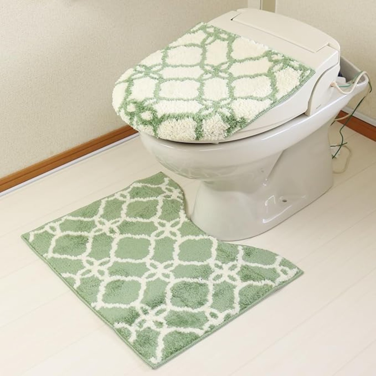 ふんわりと柔らかい肌触りの糸を使用した、U・O型/洗浄・暖房タイプ、どの型にも対応したフタカバーとトイレマットのセットです。
