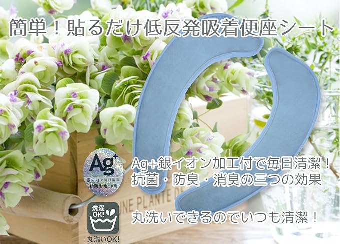 貼るだけ簡単取り付けの低反発吸着便座シートです。Ag+銀イオン加工付で毎日清潔!抗菌・防臭・消臭の三つの効果洗濯機で丸洗いOK!