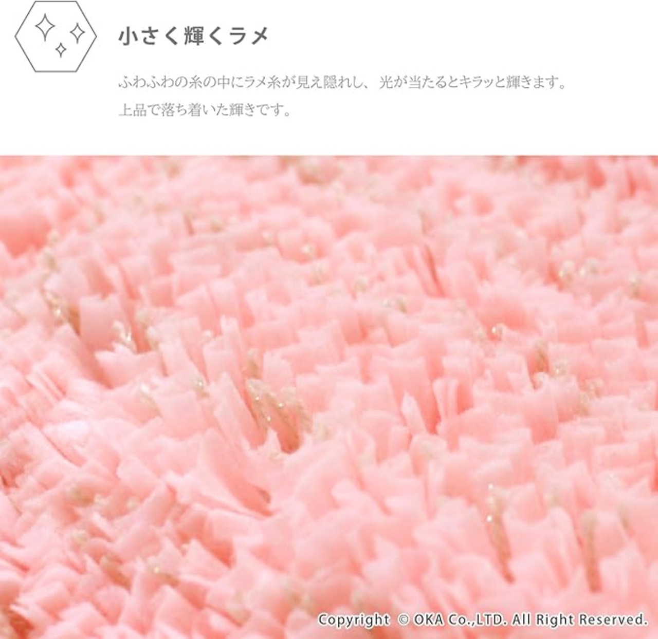 ふわっとした優しい糸に、キラッとラメが輝くアクセントラグ「フルーリスフレ」シリーズ。ふわふわの平らになった特殊な糸の中にラメの糸が見え隠れし、光が当たるとキラッと輝きます。