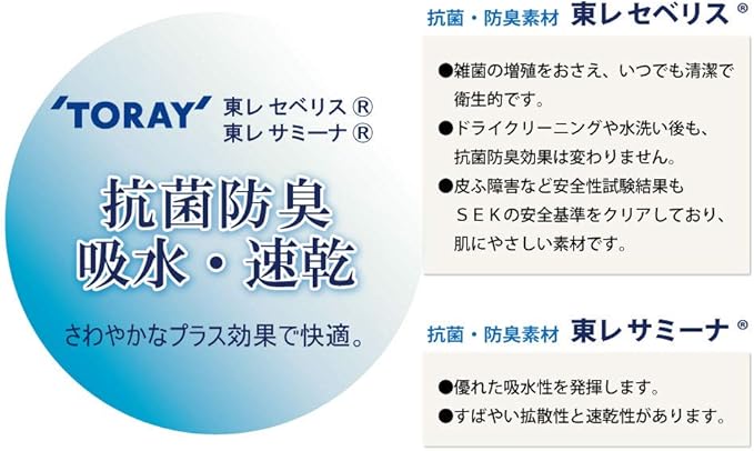 【水や汗を素早く吸収・蒸発】吸水・速乾素材の東レ サミーナ(R)により、水や汗を素早く吸収・蒸発させますので、とても肌触りがよく、お手入れやお洗濯も簡単です。【洗濯機で丸洗いOK】お手入れも簡単でご家庭の洗濯機でザブザブ洗えます。洗濯機で丸洗いのあと脱水機にかけ陰干しして下さい。