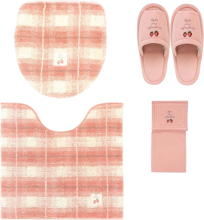 ■セット内容 1:共用ふたカバー 2:普通サイズトイレマット(約60cm 55cm) 3:スリッパ 4:ペーパーホルダーカバー ●カラー:ピンク (イチゴ)