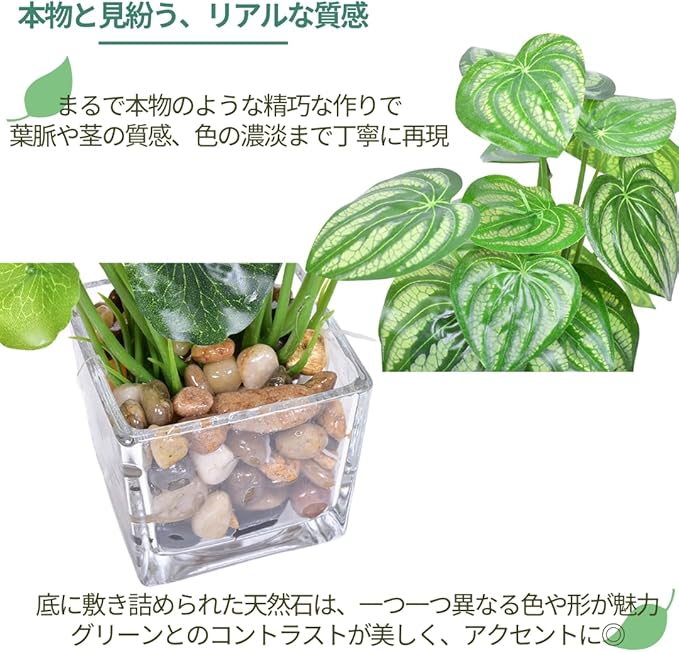 【本物と見紛う、リアルな質感】一見本物と見間違えるほどの精巧な作りで、葉脈や茎の質感、色の濃淡まで丁寧に再現。水やりや植え替えの必要がなく、忙しい方にもぴったり。虫がつく心配も、アレルギーの心配もなく、安心してグリーンを楽しめます。底に敷き詰められた天然石は、一つ一つ異なる色や形が魅力。グリーンとのコントラストが美しく、見た目にも楽しいアクセントになっています。