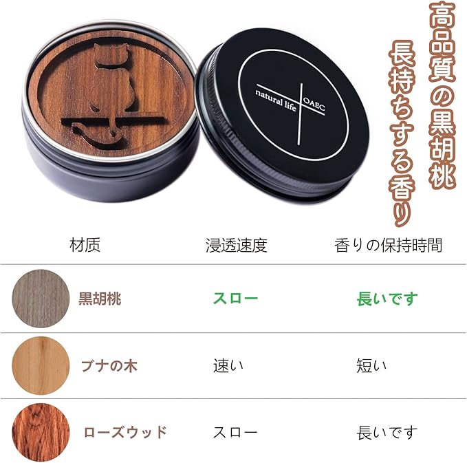 【使いやすさ】:お好みのアロマオイルを3〜4滴木にのせ、木を左右に回転させて、アロマオイルを切り欠きに均等に広げ完全に吸収されるのを待ちます。木材はアロマオイルと完璧に調和し、熱なしで気化します。アロマオイルが分解すると、香りのよい香りが放たれ、元気な喜びをもたらします。本製品は最初は強い香りがしませんが、3~5回使用すると拡散力が増します。使用回数が増え、時間が経つにつれ、木の香りがどんどん強くなり、拡散の範囲がどんどん広がっていきます。