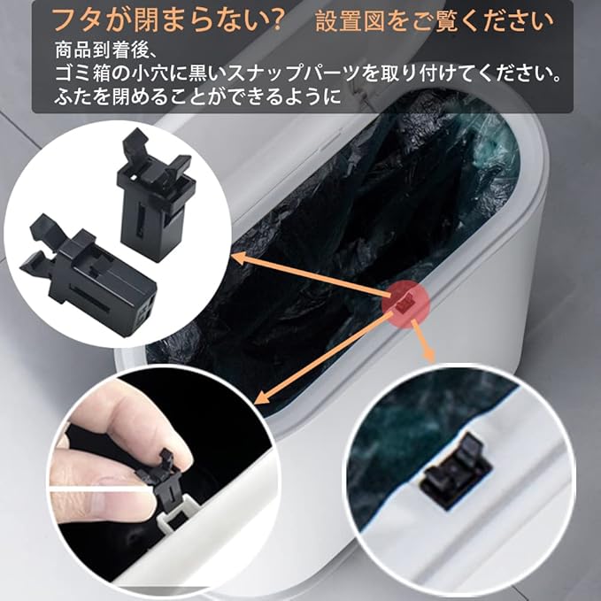 【ふたが閉まらない?】ゴミ箱には2つの黒いスナップパーツが付属しています; 取り付け時には、アウターバレルの穴に黒いバックルパーツを取り付ける必要があります; バックルを穴に押し込んだ後、蓋を閉じることができます。