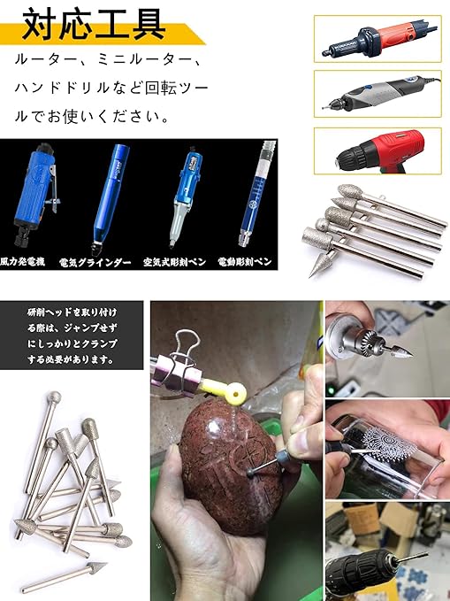 【豊富な種類&幅広い用途】:主にガラス、セラミック、樹脂、玉石、宝石、石及び硬質物体を彫刻し、金型を修理する。超硬合金、焼入れまたは窒化工具、合金鋼などの高硬度金属の研削に適しています。 ガラス、セラミック、翡翠など、硬度が高く、脆性の低い非金属材料にも使用できます。