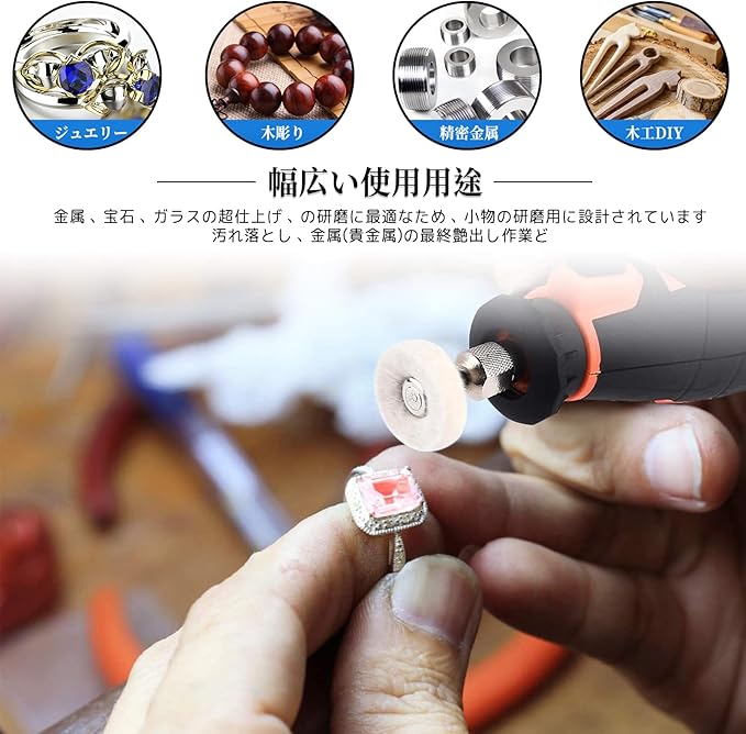 【幅広い使用用途】金属、宝石、ガラスの超仕上げ(要研磨剤)の研磨に最適なため、小物の研磨用に設計されています。汚れ落とし、金属(貴金属)の最終艶出し作業ど
