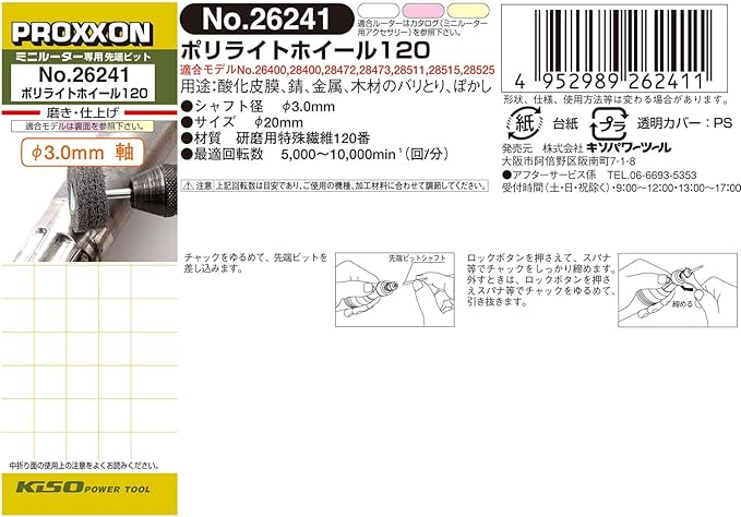 このプロクソン(PROXXON) ポリライトホイール120は、前仕上げに最適なディスク型研磨ホイールです。シャフト径φ3.0mmで、軸径3.0mmの軸付きホイールは、卓上グラインダー、アングルグラインダー、ダイグラインダーなどのプロクソン製機器に対応しています。不織布製のホイールは、エメリーを使用しており、酸化皮膜やサビとり、汚れ落とし、金属のすり傷消し・ぼかし、木材ケバとり・磨き、艶出し研磨、塗装前の面粗度調整など、多彩な用途に対応しています。ホイールの厚さは3mmで、軽量で扱いやすい設計になっています。