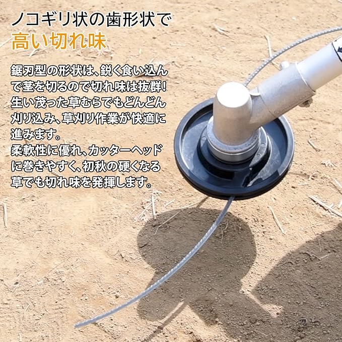 【特徴】切れ味抜群な草刈用ナイロンコードです。ナイロン材料・コード成型・せん断加工などすべて日本国内で行っております。キックバックが起きにくいナイロンコードは安全性が高く、さらに草を粉砕しながら刈り取りを行うので、草刈作業後の草を集める作業を必要としません。刈り取った場所に草が溜まらなければ、刈り具合も確認できるので刈残しも少なく済みます。柔軟性に優れて、カッターヘッドへの巻き作業も簡単です。のこぎり状の刃形状は切れ味抜群で、初秋の硬くなりやすい草でも高い切れ味を発揮します。