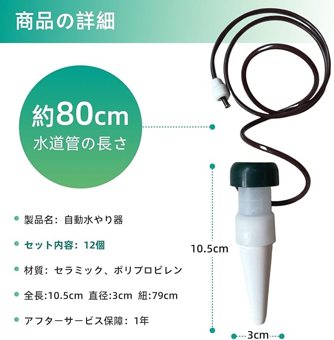 本製品は植物への給水用です。飲用には適しません。水漏れに注意し、適切に設置してください。小さな部品がありますので、お子様の手の届かない場所で使用・保管してください。