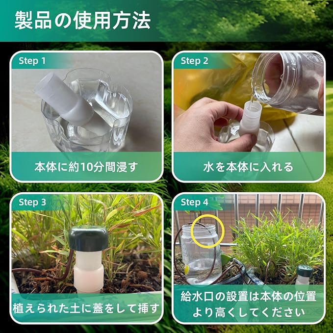 【簡単操作・便利設計】複雑な設置は必要ありません。お好きなボトルに水を入れ、キャップをボトルの口に、そして土壌に挿入するだけ。流量調節バルブで給水量も自由自在です。