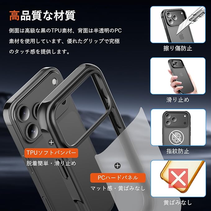 ✅【半透明・マットな質感】背面にマット感半透明デザインを採用、iPhoneの原生態美がかすかに見える、どんな色でも似合い、オシャレで高級感と神秘感が溢れている。指紋防止、黄変に耐え、長く使っても綺麗に見える。