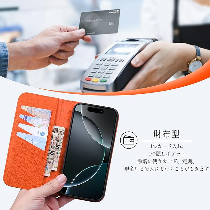 収納機能、横置きスタンド機能:iPhone17 ProMaxケース内側に実用性のカード入れポケット 4、内側ポケット 1、カード類、現金、名刺、免許証入れなどを収納でき、通勤も通学にも楽々タイプです。マグネットが内蔵されているので、ベルトがなくてもフタがぴったり閉まります。横置きスタンド機能が付きまして、好きな角度を調節できて、手放しでも動画視聴や読書に楽しめる。