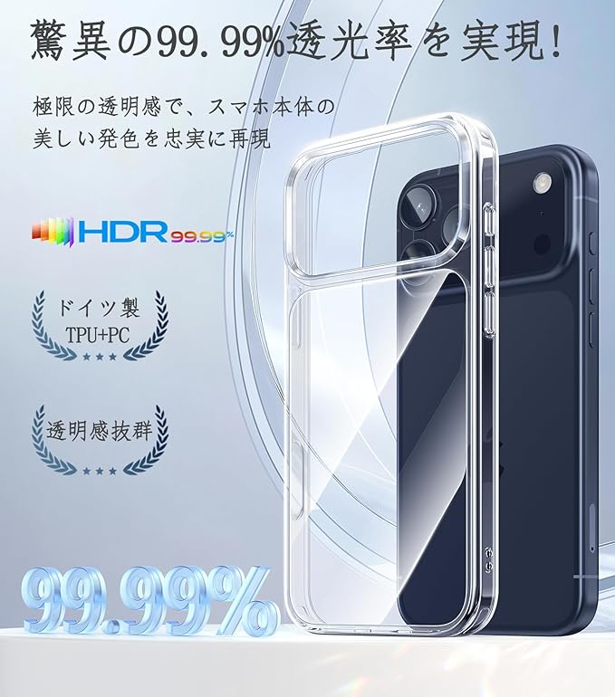 【99%超高透過で裸機の美を再現】iphone17pro max ケースは、高純度PC素材を採用。業界トップクラスの透明度を実現しました。装着時でも、装着していないかと見間違うほどのクリアさで、いphone17pro max ケースの洗練されたチタンカラーの上品な輝きまで、ありのままに忠実に再現。スマホの魅力を損なわず、長期間使っても輝きと透明感が持続。さらに、ワイヤレス充電もそのままお使いいただけ、便利な毎日をお届けします。