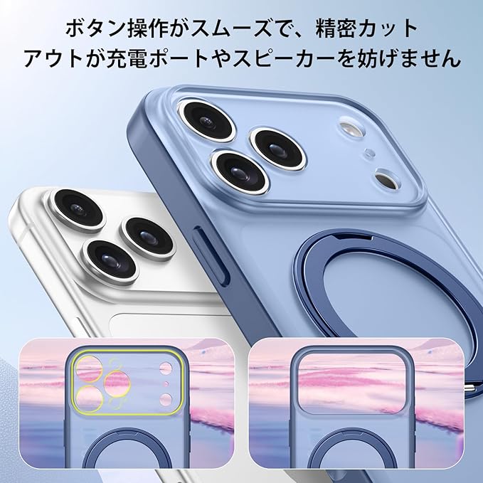 GUAGUA iPhone 17 Pro Max ケース Magsafe対応 ワイヤレス充電 回転スタンド マット感 いPhone プロマックス 肌触り 滑り止め 人気 軽量 マグセーフ耐衝撃 おしゃれ 黄ばみなし あいふおん17Pro 米軍規格 金属キックスタンド スマホケース あいふおんPro Max 用カバー(ブルー) | KAZESHOP