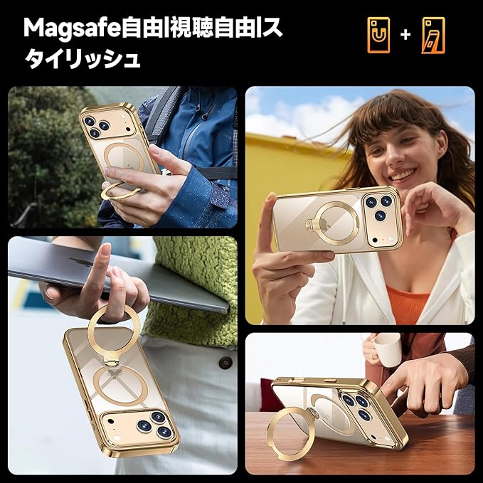 【三重保護セット!上品なメタリック光沢】OYR iPhone 17 Pro Max用クリア ケース Magsafe 対応[360 回転CD スタンド・10 万回開閉テスト][メッキバンパー・iPhone専属色][カメラ保護とガラスフィルム付き]ストラップホール付き マグセーフ アイホン17プロマックスケース マホケース17 Pro Max 人気 米軍MIL規格取得・耐衝撃(6.9インチ・ゴールド) | KAZESHOP