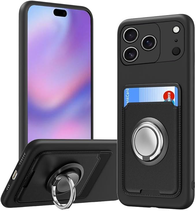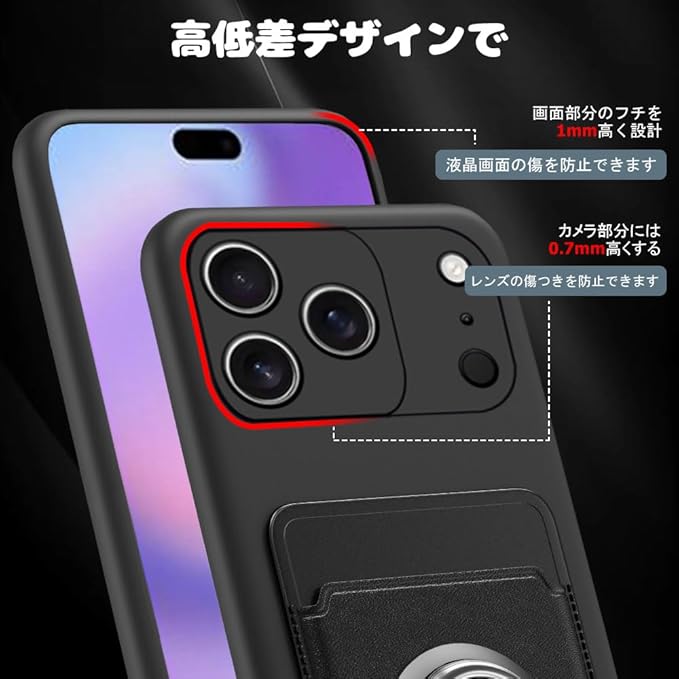 対応 iPhone 17 Pro Max ケース カード収納 リング付き 保護カバー アイフォン17promax スマホケース リング スタンド付き シリコン スタンド機能 マット質感 滑り止め 指紋防止 黑 | KAZESHOP