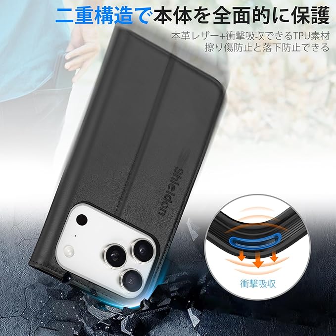 SHIELDON iPhone17 Pro 対応 手帳型ケース 本革レザー 6.3インチ 5G TPU素材 [RFIDブロッキング] カード収納 横置きスタンド機能 マグネット内蔵 ストラップ穴付き 衝撃吸収 あいふぉん 17 プロ 対応スマホケース 2025年発売 ブラック | KAZESHOP
