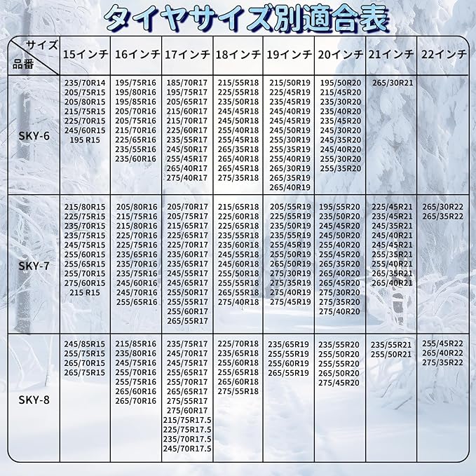 適合車両のタイプ 【SXY-8適合タイヤ】:245/85R15、255/75R15、265/70R15、265/75R15、215/85R16、235/80R16、245/75R16、255/70R16、255/75R16、265/60R16、265/70R16、235/75R17、245/70R17、245/75R17、255/65R17、255/70R17、265/65R17、275/55R17、275/60R17、215/75R17.5、225/75R17.5、235/70R17.5、245/70R17.5、225/70R18、235/65R18、255/60R18、255/65R18、265/60R18、275/55R18、235/65R19、255/55R19、255/60R19、265/55R19、235/55R20、255/50R20、255/55R20、265/50R20、275/45R20、235/55R21、255/50R21、255/45R22、265/40R22、275/35R22、乗用車。【SXY-8適合タイヤ】:245/85R15、255/75R15、265/… 表示を増やす