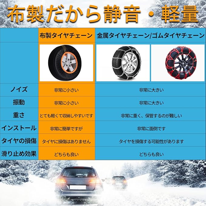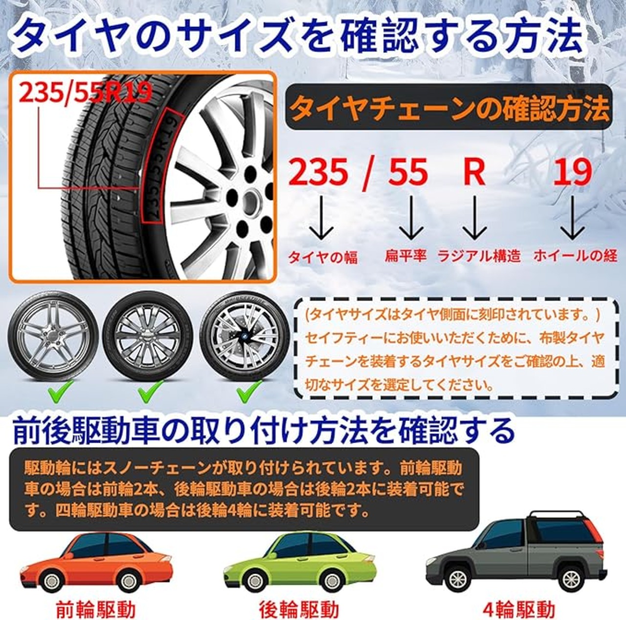 【この商品について】:布製タイヤ チェーン、2枚1セット 手袋付き 袖プロテクター 持ち運び用バッグ 日本語取付説明書付 取付3分の簡単取付 素材: 高強度耐摩耗性ポリエステル。