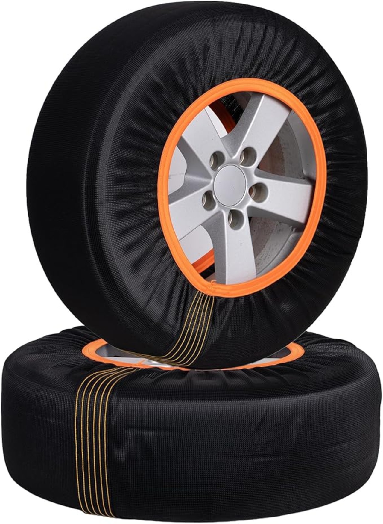 【取り付け簡単】: 布製 タイヤ チェーン、重量は超軽量です、収納簡単や持ち運びやすく。ジャッキアップ不要、女性でも数分で迅速でらくに取り付けと取り外すことはできます。ボディへの損傷を心配する必要がなく、ほとんどのタイヤサイズに対応します。ソックスの名のとおりタイヤに簡単に履かせられ、タイヤ上部から被せて車輌をすこし前進、さらに残り部分被せて、車両を動かすと自動で正しい装着位置に収まります。
