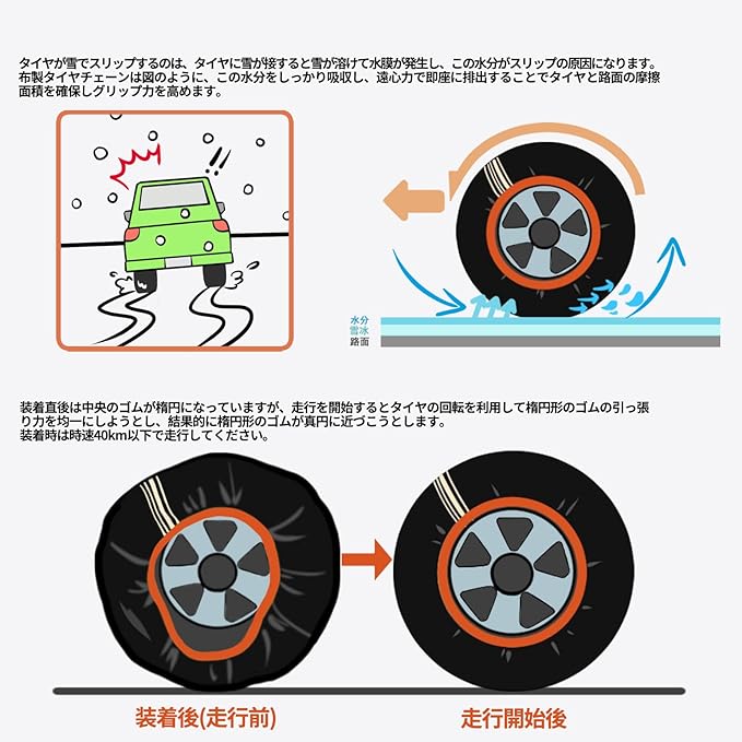 【2024年改良された弾性バンド】:スノーソックスの弾性バンドを厚くし、伸縮性を維持し、運転中の車の脱落を防ぎます。タイヤチェーンの取り付けと取り外しに使うだけにとどまらず、布製力バ一部分をしっかりと締め付けて振動を受けても外れないよう固定しつつ、走行時にはタイヤの回転の遠心力を利用して楕円形のゴムの引っ張り力を均一にしようと働きかけ、ゴムが自動で真円に近づこうとするので、走行中にタイヤチェーンが脱げてしまう事がない安定した走行を実現するのです。フィット感と安定性を高める働きをしています。