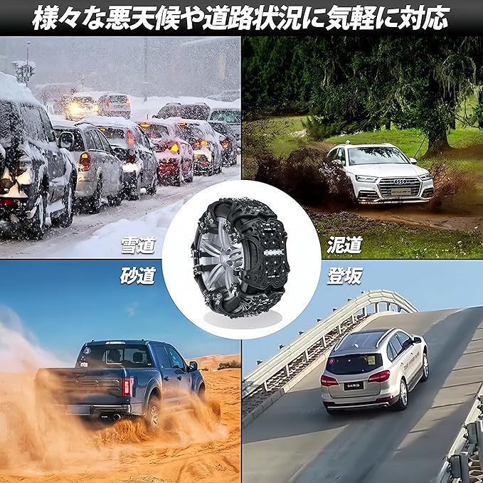 ★【多場所に適応】雪道、山の道、悪い道、泥のあるツルツル道。大雪の天気でも、レジャー、旅行、会社の通勤や帰省などに影響を与えない!良好な滑り止め効果がある滑り止めチェーン!