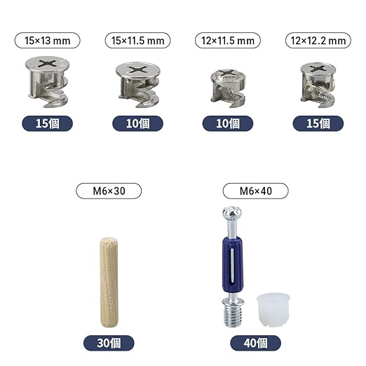 120個セット内容:カムナット:12x11.5mm(:10個)、12x12.2mm(15個)、15x11.5mm(10個)、15x13mm(15個)。カムロックネジ:40mm(20個)。プラスチック拡張ナット:10x9mm(20個)。木製 ダボ ピン:M6x30 mm (30個)