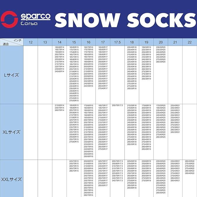 ■簡単装着:ジャッキアップ不要。車種を選びません。3分程で素早く簡単に装着可能です。「スパルコ・スノーソックス」はどなたでも簡単装着。タイヤ上部から被せて車輌をすこし前進、さらに残り部分被せて、車両を動かすと自動で正しい装着位置に収まります。■静音小振動:静音性は金属チェーンよりも明らかな優位性能。「スパルコ・スノーソックス」の最大の特徴で、非常に静かで乗り心地を損ないません。布製なのでタイヤ、アルミホイールにもダメージを与えません。スチールチェーン使用の場合は走行時、ホイールに傷などダメージを与える場合があります。さらに、スチールチェーンはある程度走行した後に締め直しが必要ですが、「スパルコ・スノーソックス」は多少曲がって装着しても、走行中に自動的に補正し、センターリングされます。