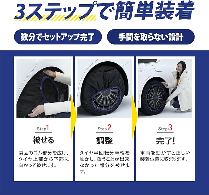 ■簡単装着:ジャッキアップ不要。車種を選びません。3分程で素早く簡単に装着可能です。「スパルコ・スノーソックス」はどなたでも簡単装着。タイヤ上部から被せて車輌をすこし前進、さらに残り部分被せて、車両を動かすと自動で正しい装着位置に収まります。■静音小振動:静音性は金属チェーンよりも明らかな優位性能。「スパルコ・スノーソックス」の最大の特徴で、非常に静かで乗り心地を損ないません。布製なのでタイヤ、アルミホイールにもダメージを与えません。スチールチェーン使用の場合は走行時、ホイールに傷などダメージを与える場合があります。さらに、スチールチェーンはある程度走行した後に締め直しが必要ですが、「スパルコ・スノーソックス」は多少曲がって装着しても、走行中に自動的に補正し、センターリングされます。