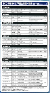 ●エコメッシュIIタイヤサイズ適合表及び不適合車種一覧表、不適合タイヤを必ず確認してください。●必ず時速50㎞以下で走行してください。●急発進、急ハンドル、急ブレーキは絶対避けてください。●商用車等には使用しないでください。●砂利道走行は避けて下ください。●必ず装着タイヤに適合したサイズか確認してください。●タイヤと車体のすき間(クリアランス)は2.5cm以上必要です。●必ず駆動輪へ取付けてください。FF車(前輪駆動車)は前輪へ、FR車(後輪駆動車)は後輪へ取付けてください。4WD車は車両の取扱説明書に従ってください。
