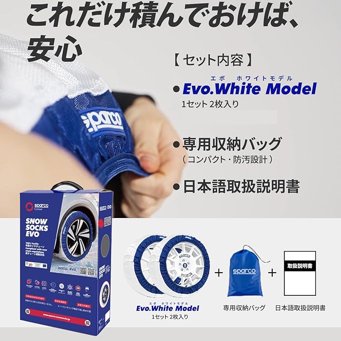 スパルコスノーソックス EVOモデル ホワイト Sサイズ スタッドレス タイヤチェーン 布 非金属 布チェーン 布製タイヤチェーン タイヤソックス 布製タイヤ滑り止め 簡単 軽量 滑り防止 収納 雪道 グリップ タイヤカバー スノーチェーン 非金属 165/60R15 | KAZESHOP