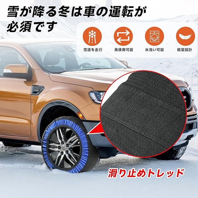 【安全上のご注意】●ご購入する前に、タイヤサイズによって相応なタイヤチェーンを確認してください。 ●本商品の装着時の制限速度は 40km/h です。40km/h 以上の速度を出しますと脱落及び重大な事故の要因となりま すので制限速度は厳守して下さい。 ●耐久性は路面の状態や運転状況によって異なり、アスファルト及びコンクリート露出路面での装着走行は破損及び製品寿命を著しく低下させます。 ●本商品に破れ等の破損が生じた場合は、速やかに使用を中止して下さい。 【静かで安定する走行】雪道で金属タイヤチェーン同等の機能を発揮しますが、特殊合成繊維の布を使用するため。走行時に静かで滑らかな乗り心地実現できる布製タイヤチェーンです。騒音や振動が少なく、積雪路や凍結路でも安定性があります。そのため、乗り心地が向上するとされています。更に、布製なので愛車のタイヤが傷つきにくいです。