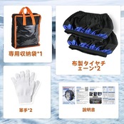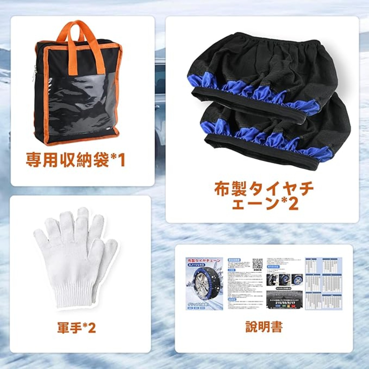 【商品内容】:布制タイヤチェーン 2、専用収納パック 1、手袋 2(1セットには2輪分収納されています。4輪に装着希望の場合は2セットでご注文ください)【梱包サイズ】:24cm*28cm*11cm【重量】:1.05kg【素材】:ポリエステル(PLY)