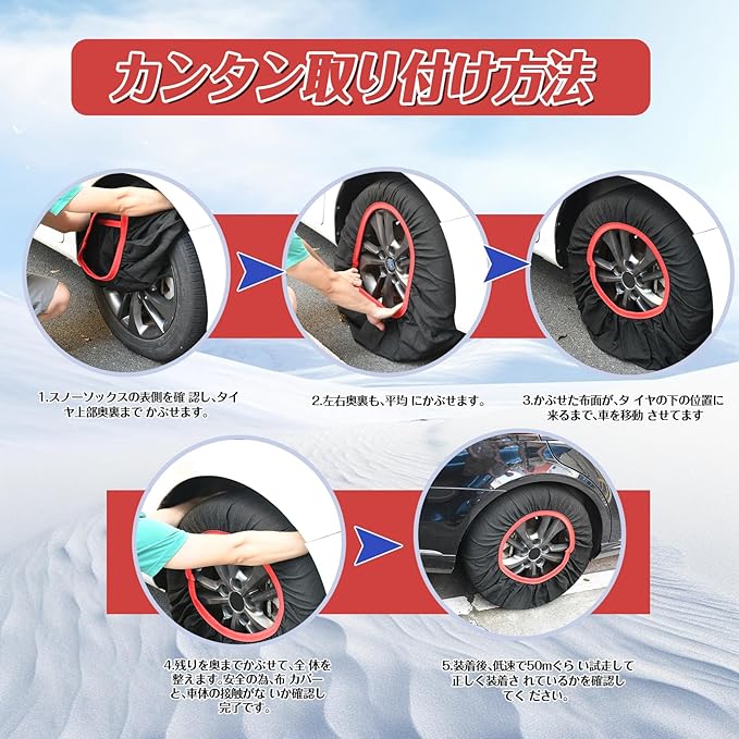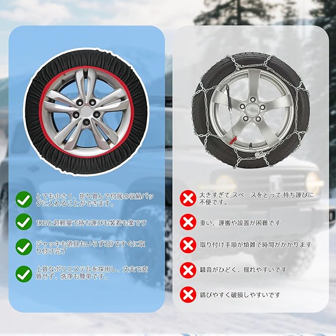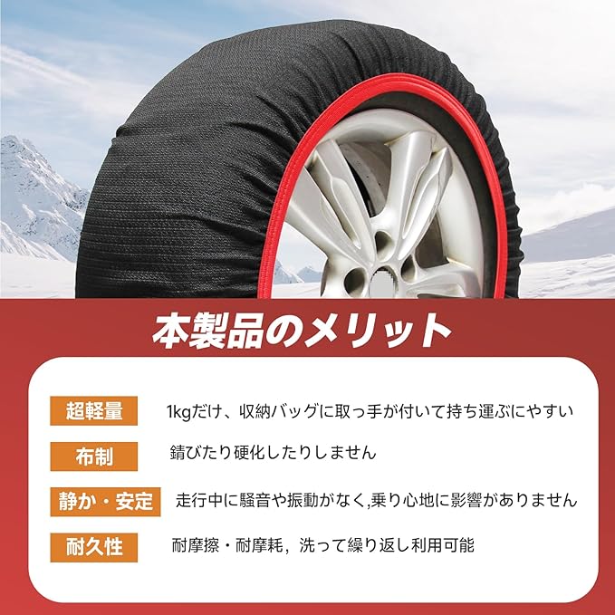 【静かで安定する走行】雪道で金属タイヤチェーン同等の機能を発揮しますが、特殊合成繊維の布を使用するため。走行時に静かで滑らかな乗り心地実現できる布製タイヤチェーンです。騒音や振動が少なく、積雪路や凍結路でも安定性があります。そのため、乗り心地が向上するとされています。更に、布製なので愛車のタイヤが傷つきにくいです。