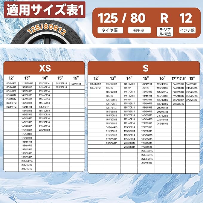 L対応サイズ 185/80R14、185R14、195/75R14、195/80R14、195R14、205/70R14、205/75R14、205/80R14、205R14、215/70R14、215/75R14、225/70R14、235/60R14、245/60R14、165/80R15、165R15、175/75R15、175/80R15、175R15、185/70R15、185/80R15、185R15、195/70R15、195/75R15、205/65R15、205/70R15、215/60R15、215/65R15、215/70R15、225/60R15、225/65R15、230/60R15、235/55R15、235/60R15、245/60R15、255/55R15、275/50R15、165/75R16、175/70R16、175/75R16、185/65R16、185/70R16、185/75R16、195/60R16、195/65R16、195/70R16、205/60R16、205/65R16、215/55R16、215/60R16、220/60R16、225/55R16、225/60R16、235/50R16、235/55R16、245/50R16、245/55R16、255/50R16、165/70R17、175/65R17、185/60R17、185/65R17、195/55R17、195/60R17、205/50R17、205/55R17、205/60R17、215/50R17、215/55R17、225/50R17、225/55R17