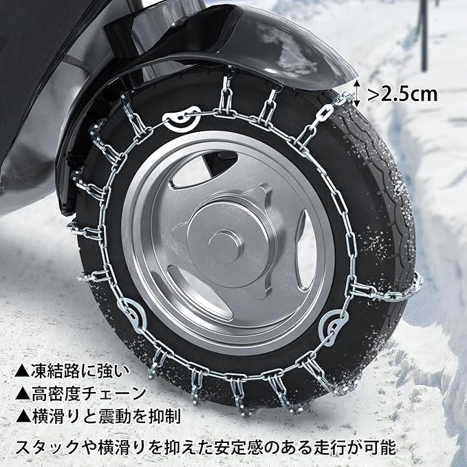 <隙間>安装後、雪チェーンとタイヤハウスとの距離が2.5cm以上です。