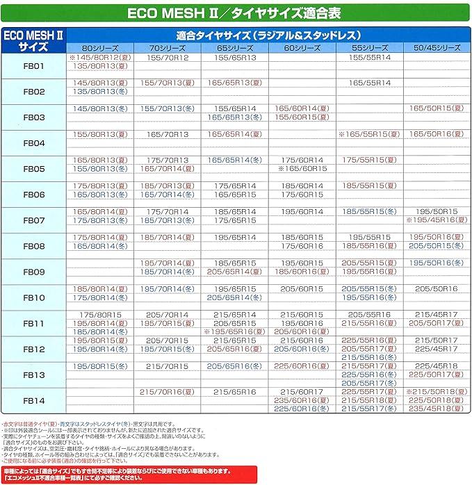 ●エコメッシュIIタイヤサイズ適合表及び不適合車種一覧表、不適合タイヤを必ず確認してください。●必ず時速50㎞以下で走行してください。●急発進、急ハンドル、急ブレーキは絶対避けてください。●商用車等には使用しないでください。●砂利道走行は避けて下ください。●必ず装着タイヤに適合したサイズか確認してください。●タイヤと車体のすき間(クリアランス)は2.5cm以上必要です。●必ず駆動輪へ取付けてください。FF車(前輪駆動車)は前輪へ、FR車(後輪駆動車)は後輪へ取付けてください。4WD車は車両の取扱説明書に従ってください。