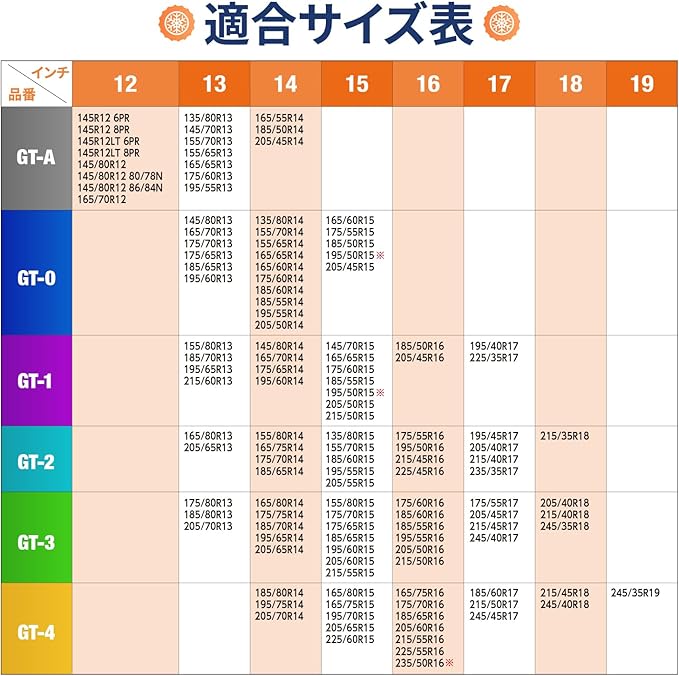 GT-B 対応タイヤサイズ 215/75-14 225/70-14 185/75-15 185/80-15 205/70-15 215/70-15 225/65-15 245/60-15 175/80-16 185/75-16 225/60-16 235/60-16 245/55-16 185/70-17 195/60-17 225/55-17 245/50-17 255/50-17 275/45-17 205/55-18 225/50-18 245/45-18 255/45-18 235/45-19 245/40-19 255/40-19 265/40-1