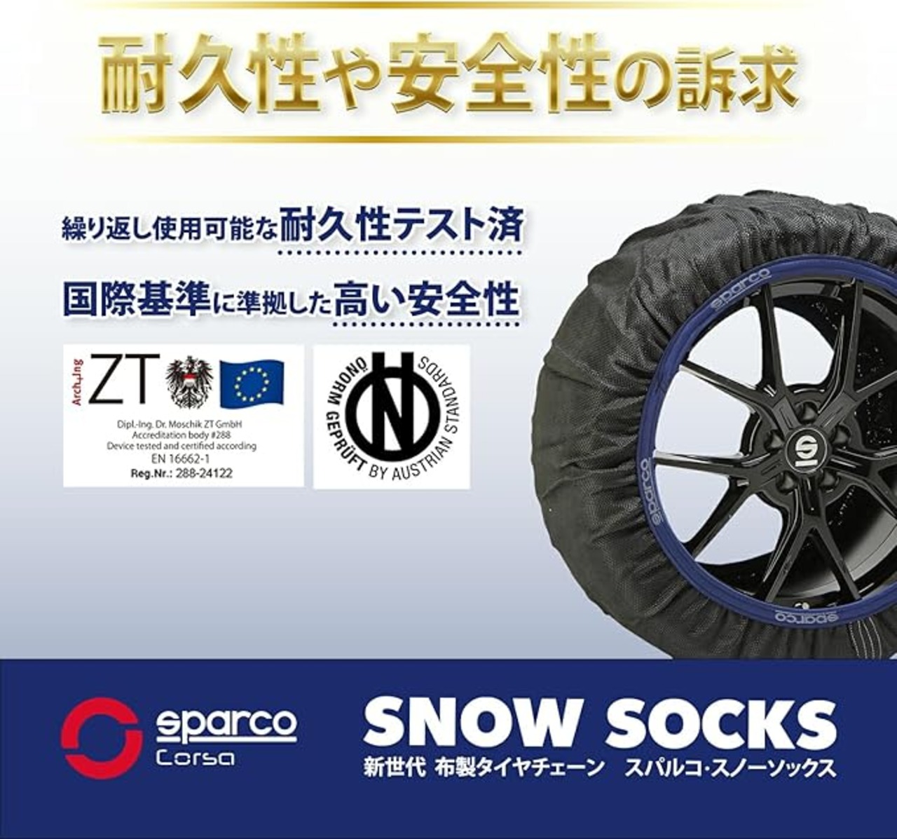 100% Made in Europeの最高品質テキスタイル(布製)スノーチェーン。新チェーン規制対応品です。チェーン規制対象路線では、大雪の時にはスタッドレスタイヤであってもチェーンの装着が義務付けられました。全国的に導入エリアが拡大しています。「スパルコ・スノーソックス」の高品質ポリエステル繊維は最も厳しいスノーチェーンの規格「 NORM」を取得しています。高いグリップ力で日本の雪路においても、圧雪、深雪、アイスバーンなどのコンディションにおいて安定した走行を提供いたします。