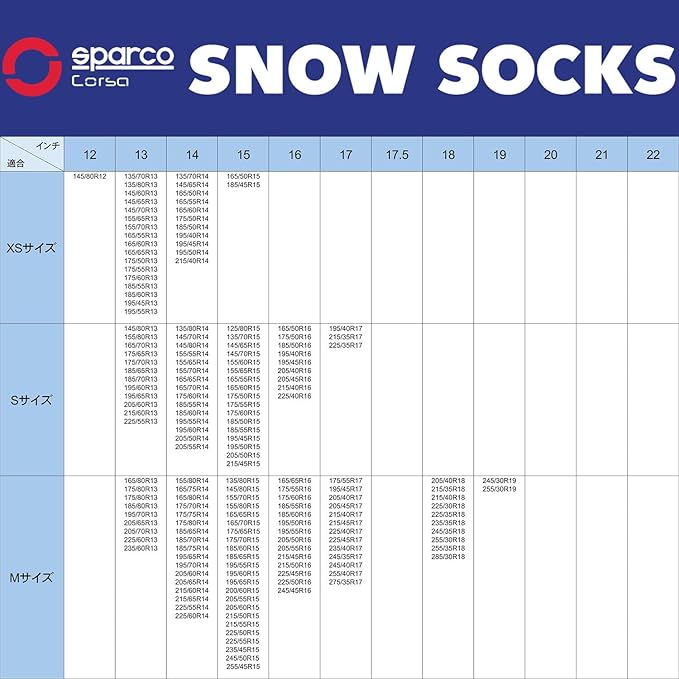 新チェーン規制対応品です。チェーン規制対象路線では、大雪の時にはスタッドレスタイヤであってもチェーンの装着が義務付けられました。全国的に導入エリアが拡大しています。「スパルコ・スノーソックス」の高品質ポリエステル繊維は最も厳しいスノーチェーンの規格「 NORM」を取得しています。高いグリップ力で日本の雪路においても、圧雪、深雪、アイスバーンなどのコンディションにおいて安定した走行を提供いたします。