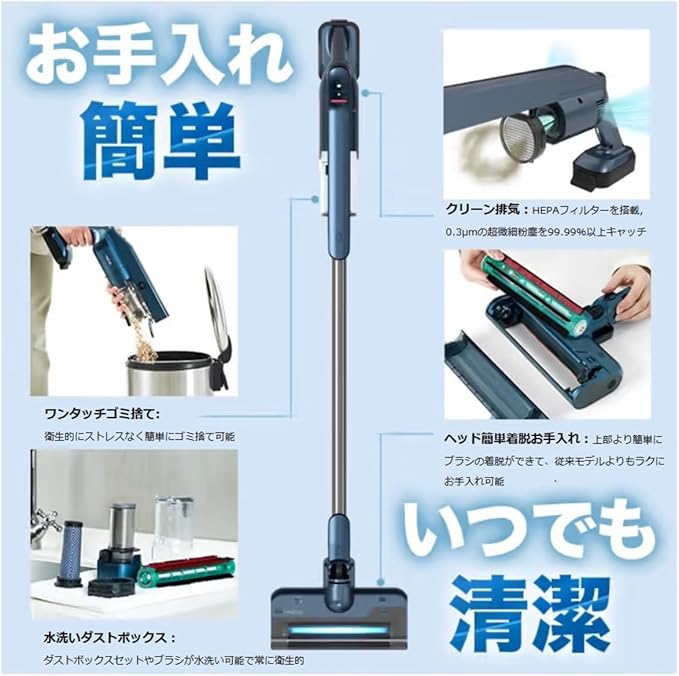 UV一体型ヘッドで清潔、HEPAフィルターを搭載し0.3μmの超微細粉塵を99.99%以上キャッチ。ダストセンサーが目に見えないゴミを検知し、 取り逃しゼロへ。大きなゴミから微細な ハウスダストまで 吸い取る強力吸引。