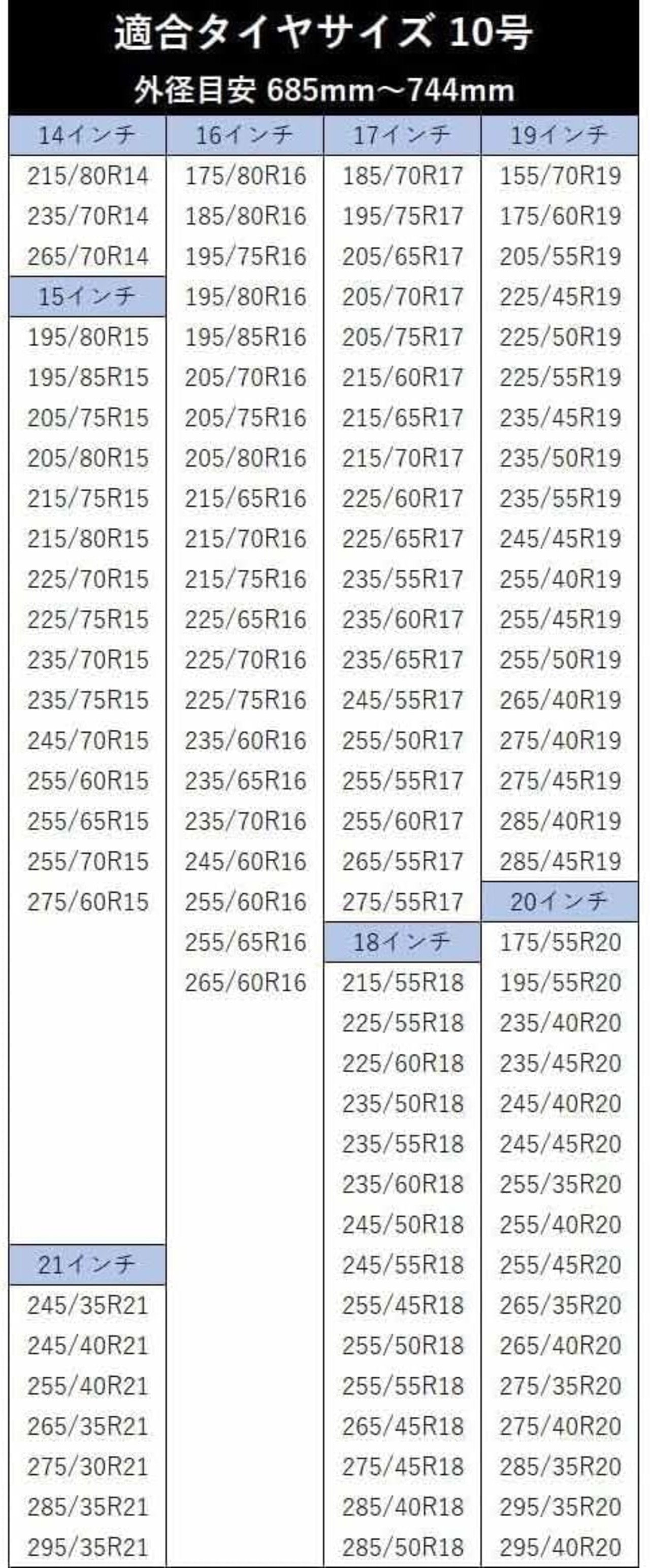 適合タイヤサイズ(10号) 外径目安(685mm~744mm)