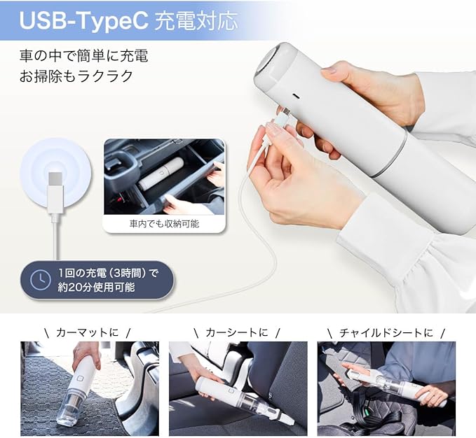 USB-Type C ケーブルで車内でも簡単充電、収納できます(PD非対応、稼働時間:約20分)。