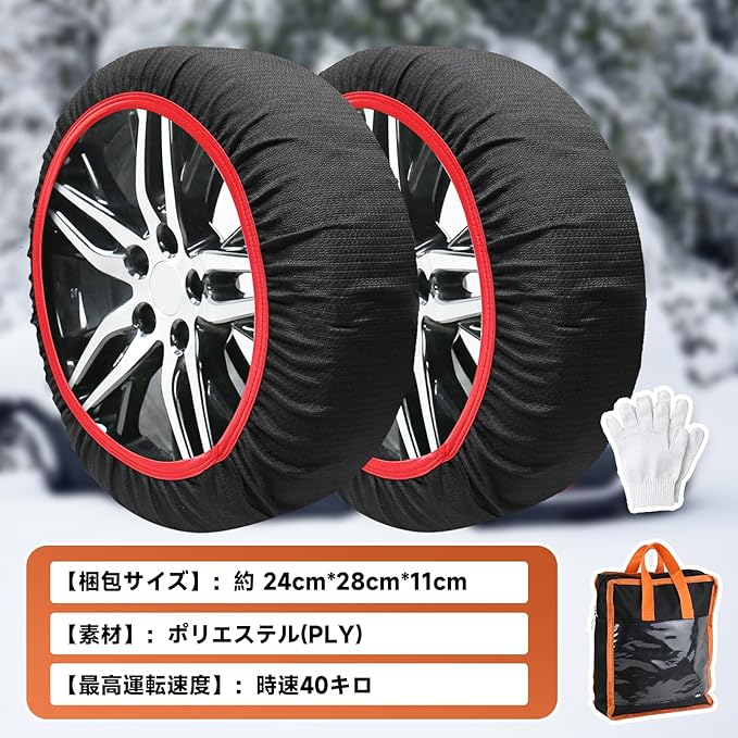 【商品内容】:布制タイヤチェーン 2、専用収納パック 1、手袋 2(1セットには2輪分収納されています。4輪に装着希望の場合は2セットでご注文ください)【梱包サイズ】:24cm*28cm*11cm【重量】:1.05kg【素材】:ポリエステル(PLY)